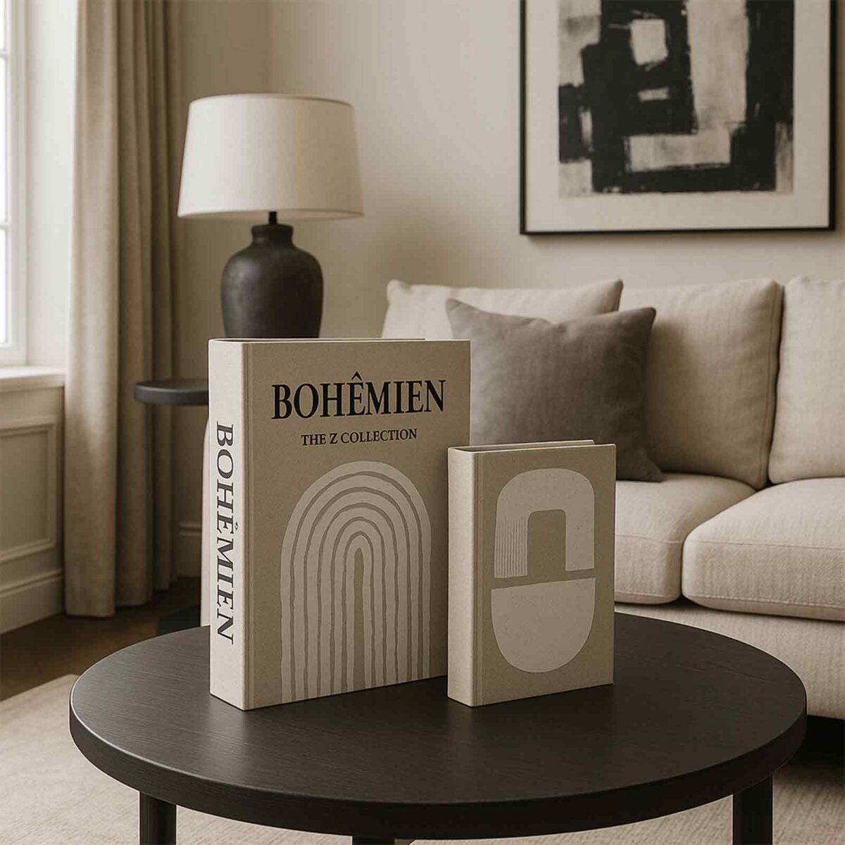 Ένα μοναδικό διακοσμητικό βιβλίο, κατασκευασμένο από φυσικό ξύλο και επενδυμένο με εκλεκτό λινό ύφασμα. Με minimal γεωμετρικό σχέδιο και κομψή αισθητική, ανοίγει για να αποκαλύψει έναν κρυφό αποθηκευτικό χώρο. Ιδανικό για να προσθέσετε έναν αέρα διακριτικής πολυτέλειας και μοντέρνας αρμονίας στο σαλόνι, το γραφείο ή το υπνοδωμάτιό σας.