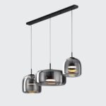 Το πολύφωτο κρεμαστό φωτιστικό smoky glass διαθέτει πολλαπλές γυάλινες καμπάνες τοποθετημένες σε διαφορετικά ύψη, δημιουργώντας δυναμική και ισορροπημένη σύνθεση. Ο μεταλλικός σκελετός σε μαύρη απόχρωση προσφέρει σταθερότητα και αντοχή, ενώ συμπληρώνει ιδανικά το μοντέρνο ύφος του φωτιστικού.