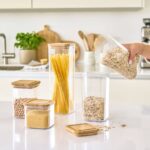 Το καπάκι από φυσικό μπάμπου προσθέτει ζεστασιά και κομψότητα, ενώ εφαρμόζει σωστά για να προστατεύει τα ζυμαρικά από υγρασία και σκόνη. Ο συνδυασμός γυαλιού και μπάμπου προσφέρει μια οικολογική και αισθητικά ανώτερη επιλογή σε σχέση με τα πλαστικά δοχεία.