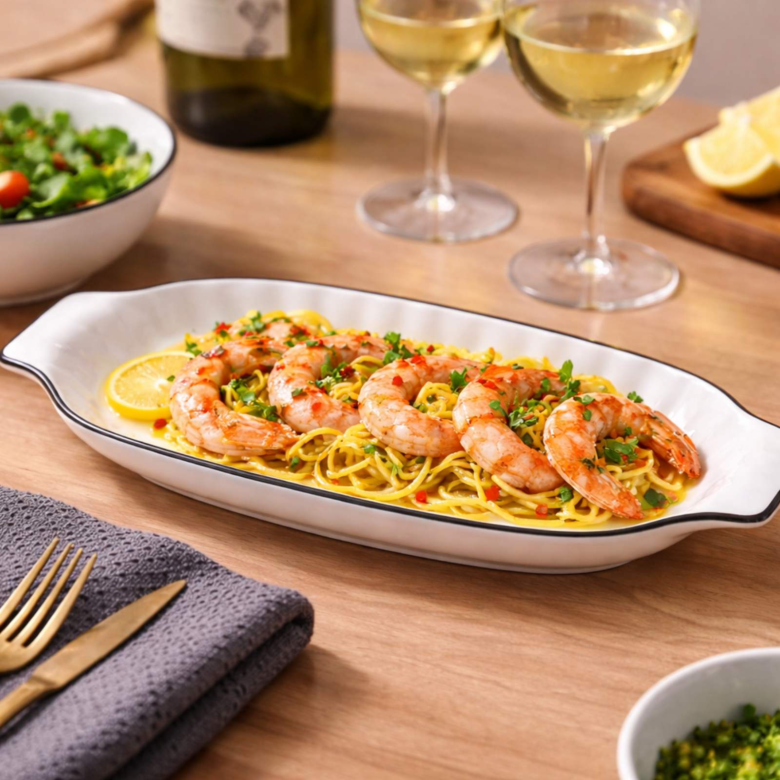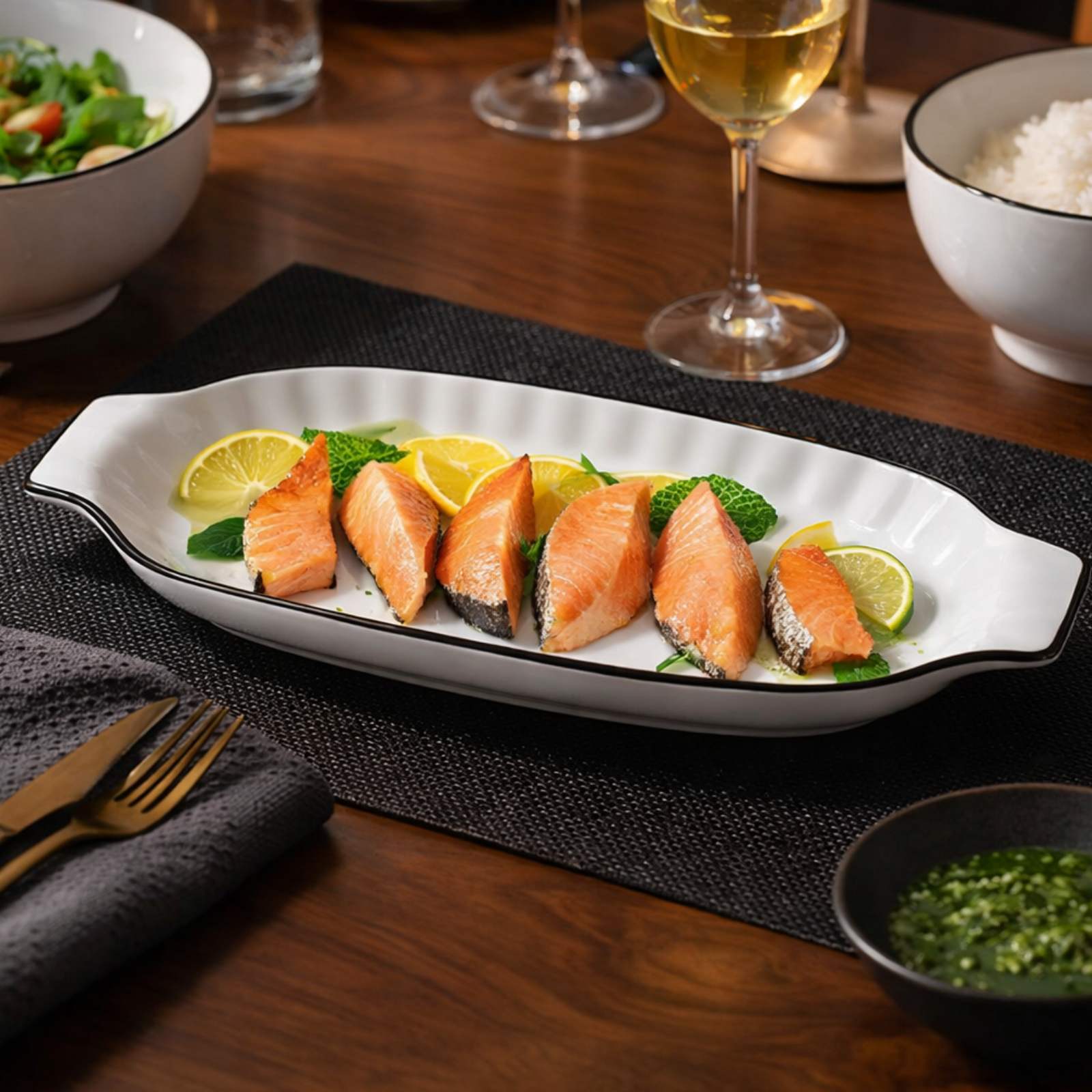 Το μακρόστενο σχήμα της επιτρέπει κομψή διάταξη των τροφίμων, αναδεικνύοντας τα χρώματα και τις υφές τους.