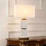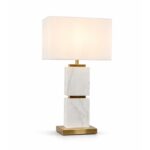 Πολυτελές επιτραπέζιο φωτιστικό από φυσικό μάρμαρο με χρυσές λεπτομέρειες και υφασμάτινο καπέλο. Μοντέρνος luxury σχεδιασμός, ζεστό φως και πιστοποίηση CE, ιδανικό για σαλόνι ή υπνοδωμάτιο.