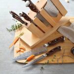 Το σετ συνδυάζει ανοξείδωτο ατσάλι 5Cr15MoV υψηλής απόδοσης, εργονομικές λαβές από ξύλο και σταθερή ξύλινη βάση, προσφέροντας ιδανική ισορροπία, αντοχή και πολυτέλεια.