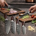 των λεπίδων είναι εμπνευσμένος από ιαπωνική αισθητική, με κομψά μοτίβα που προσδίδουν έναν premium, luxury χαρακτήρα, ενώ παράλληλα μειώνουν την αντίσταση κατά την κοπή. Τα τρόφιμα δεν “κολλάνε” στη λεπίδα, επιτρέποντας πιο γρήγορη και ασφαλή εργασία.